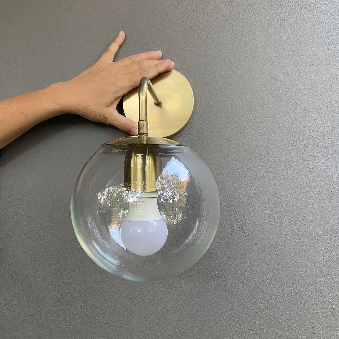 Aplique con base de chapa y brazo de hierro de 18 cm de largo con globo de 18 cm de diámetro en vidrio transparente u Opal