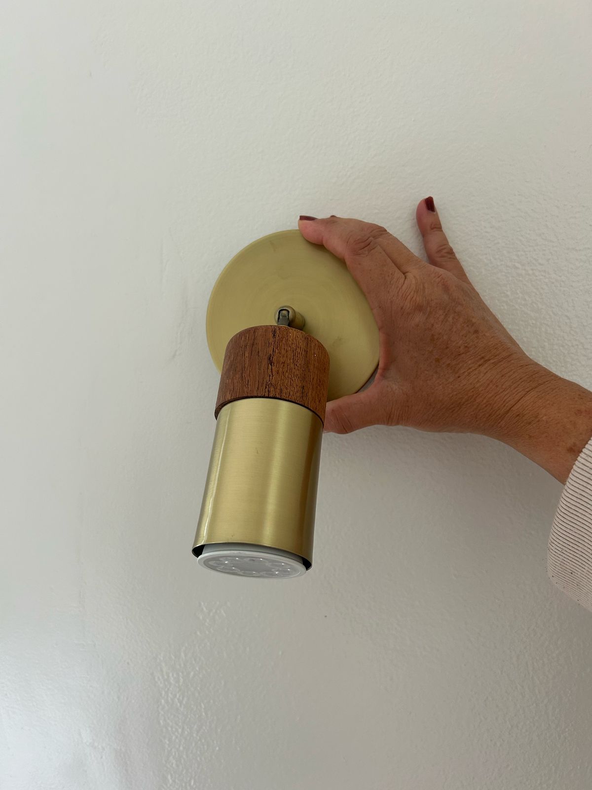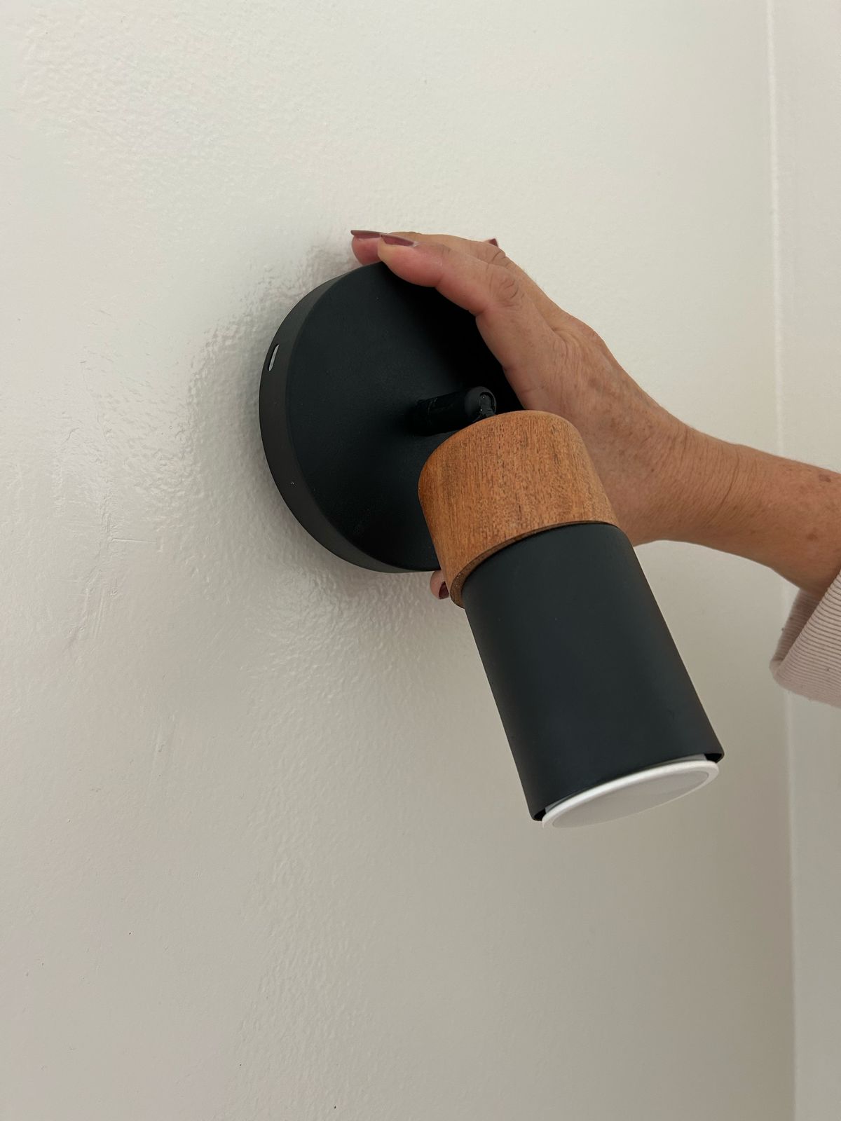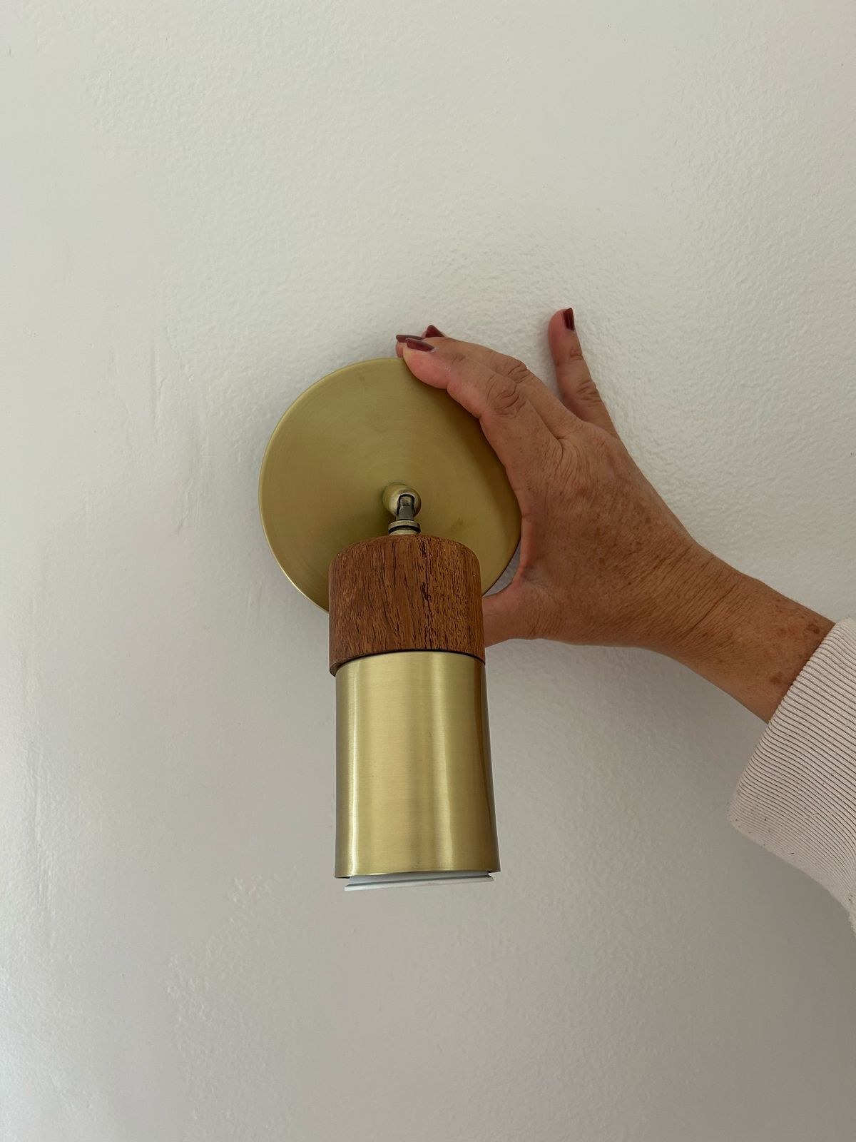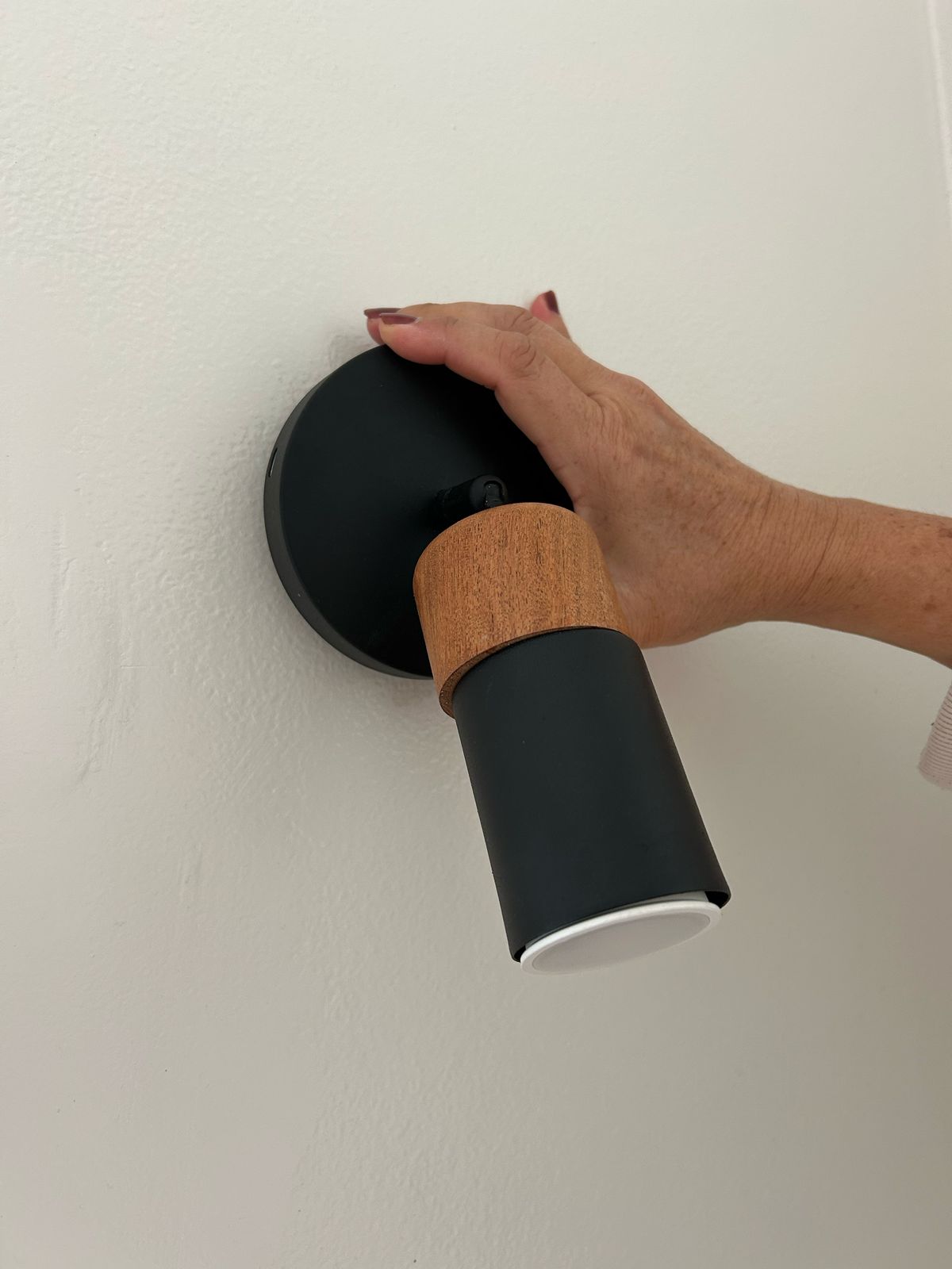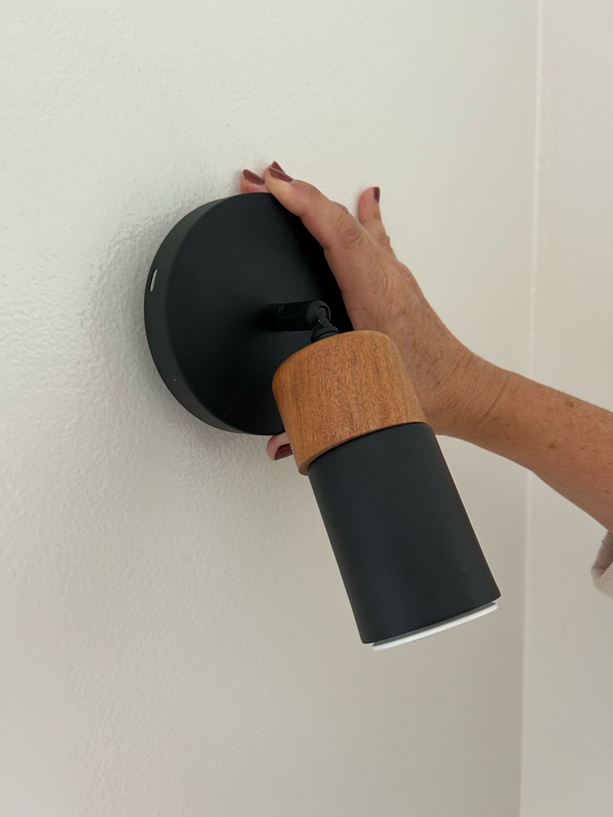 Aplique fabricado en chapa y madera petiribi. Disponible en negro, blanco, bronce o cromado. Para pared o techo. Incluye luz dicroica.
