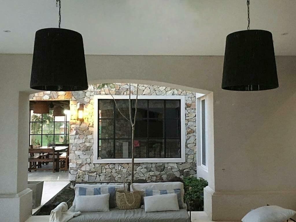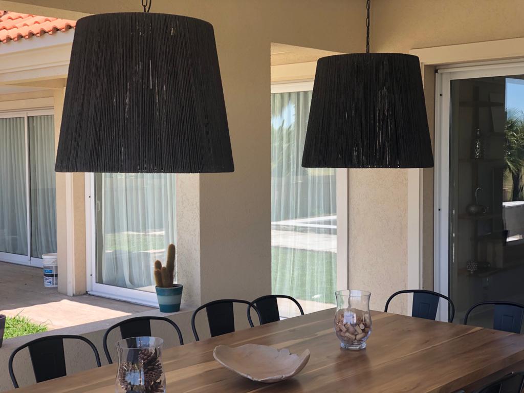 Modelo de lámparas colgantes tejidas en hilo de papel. Disponible en diferentes tamaños. En color kraft o negro.