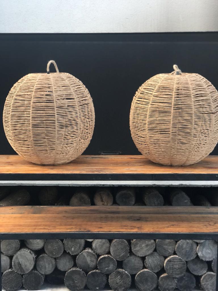 Lampara globo tejida en hilo de papel. Disponible en kraft o negro