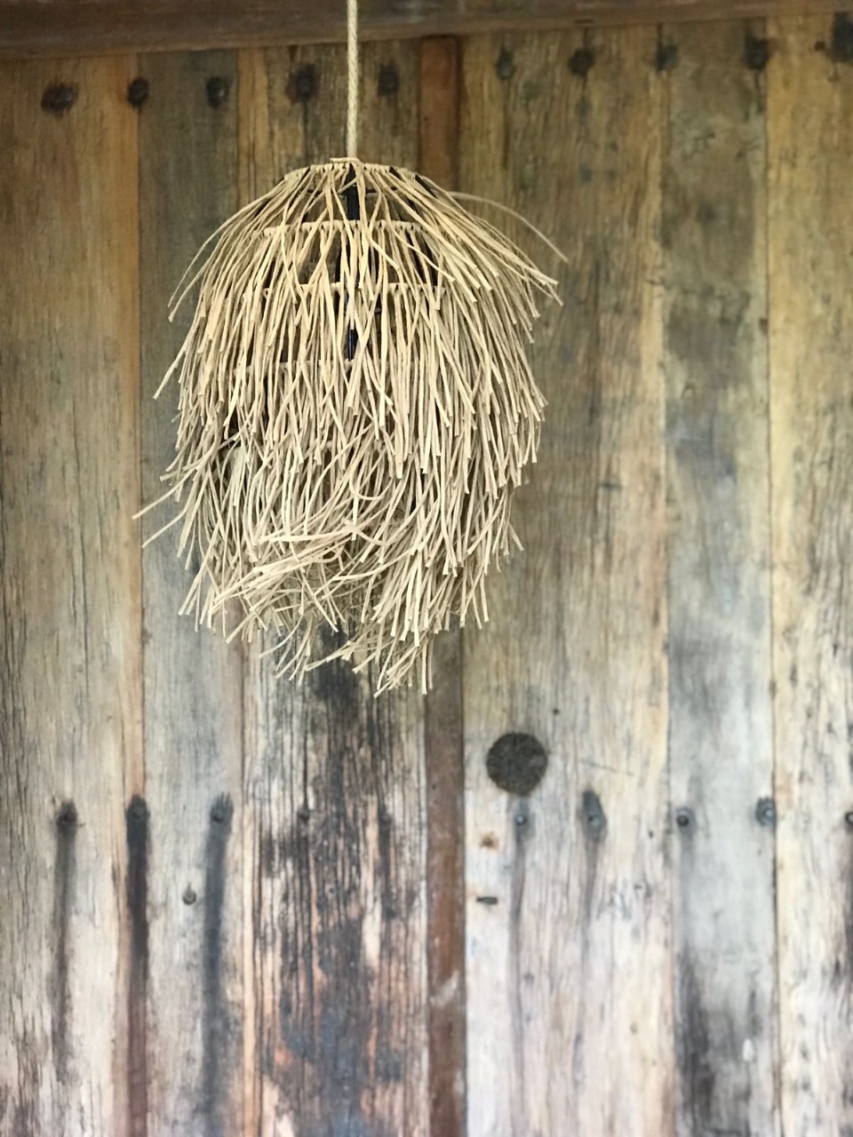 Lampara con flecos de hilo de papel. Disponible en kraft o negro.