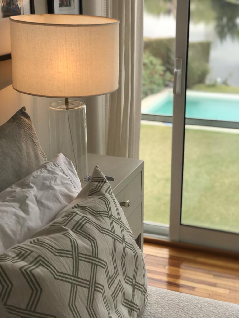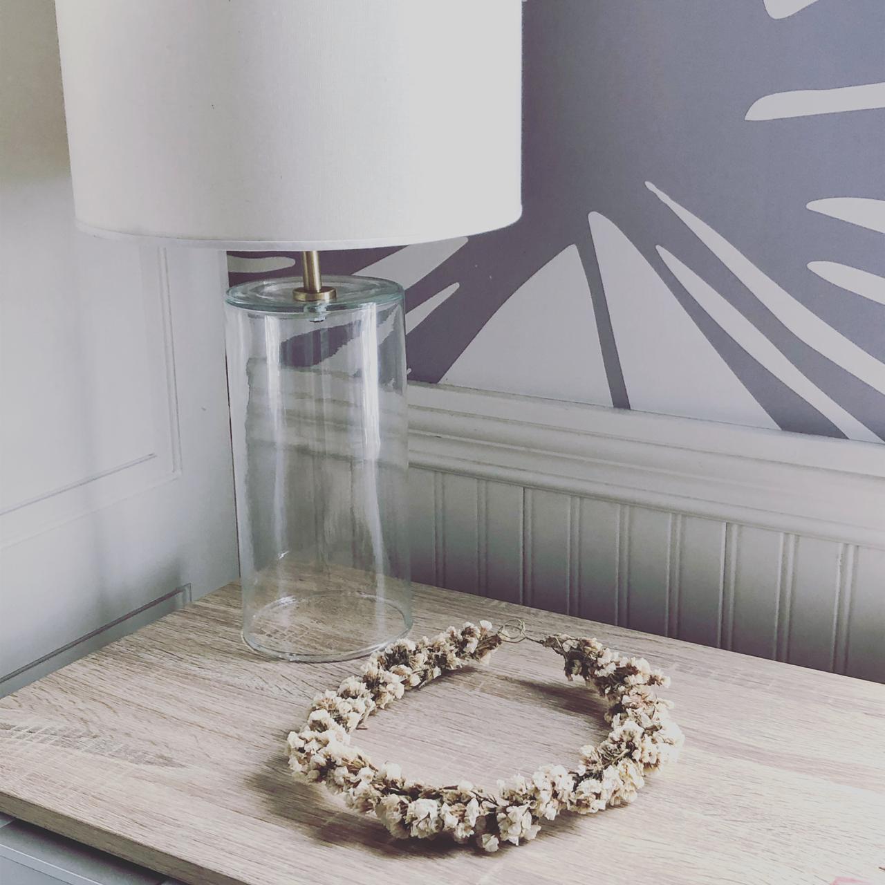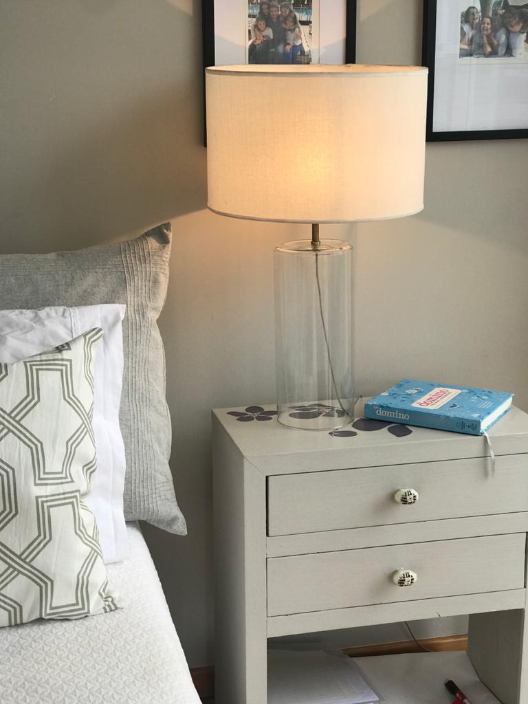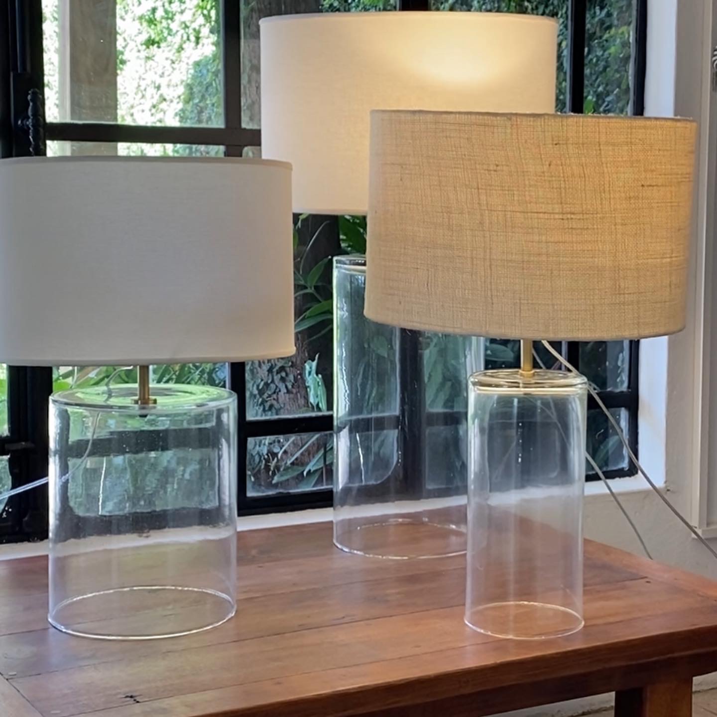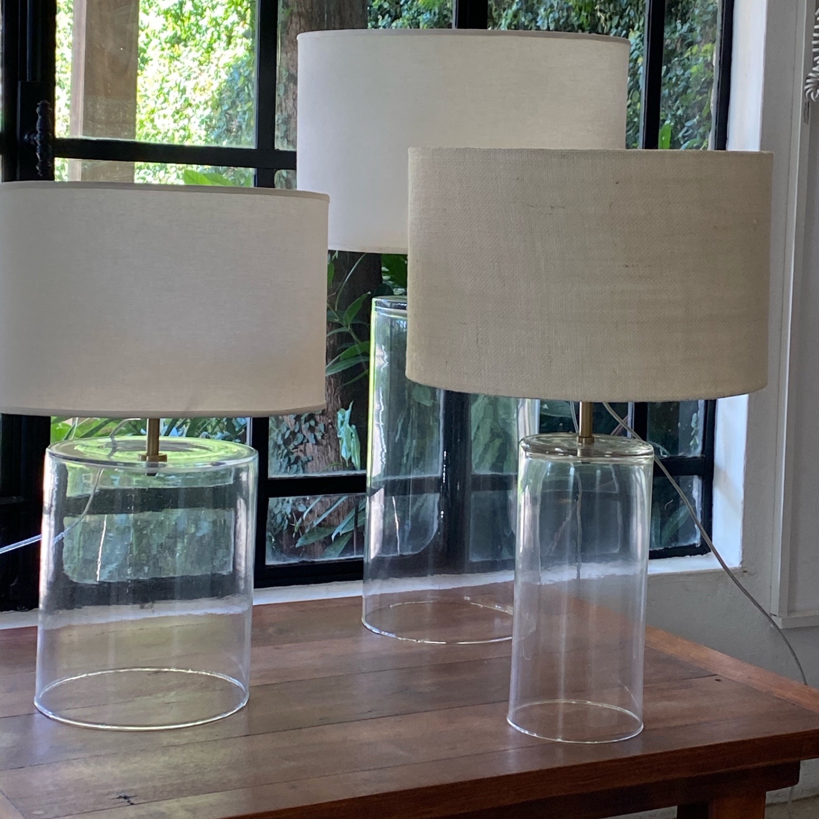 Lámpara de vidrio de mesa con pantalla de lino o arpillera disponible en 3 tamaños. La pantalla puede ser en color crudo o negro. Consultar por otros colores.