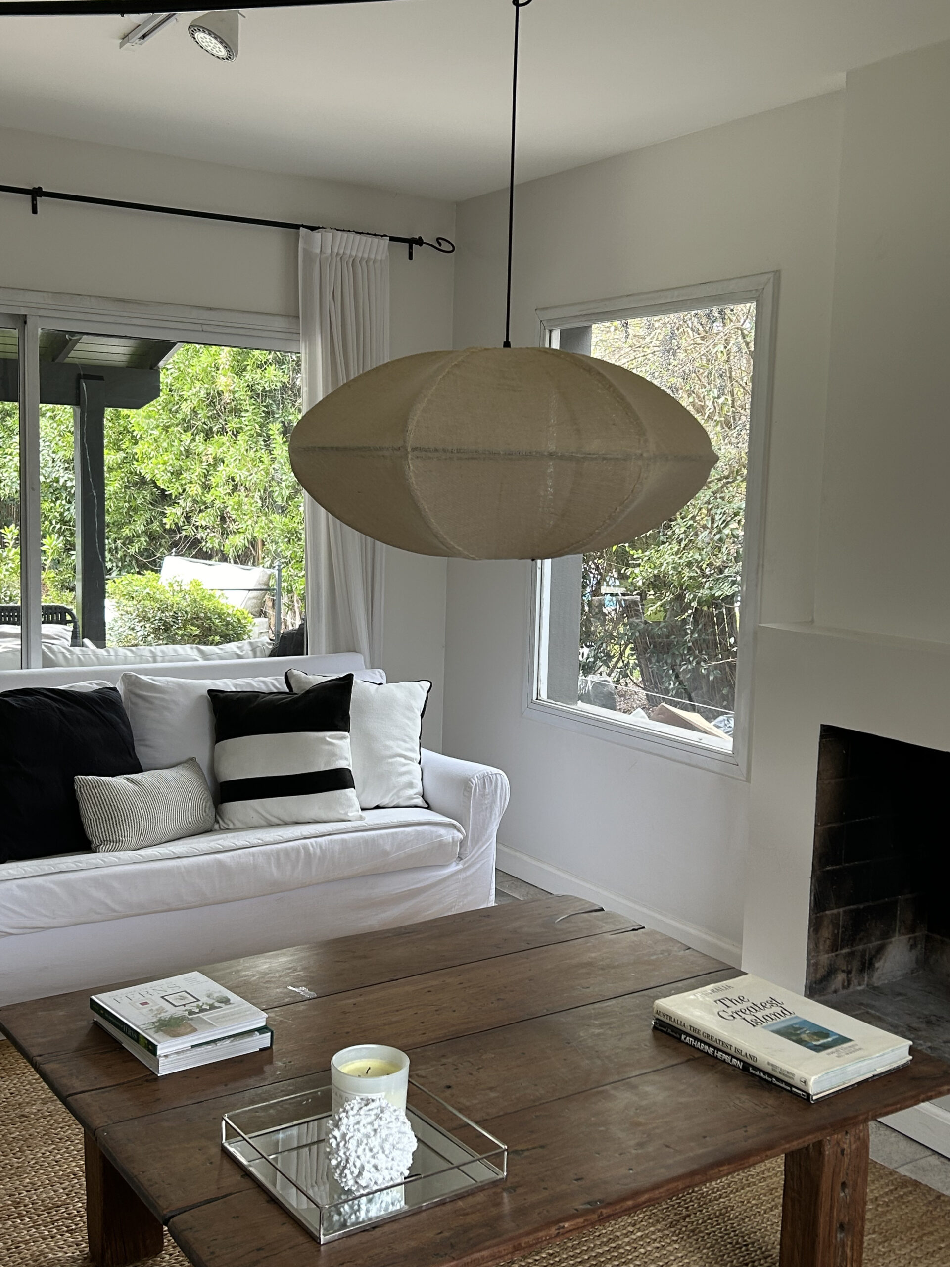 Lampara con estructura de hierro y cubierta en tela arpillera. Disponible en diferentes tamaños.