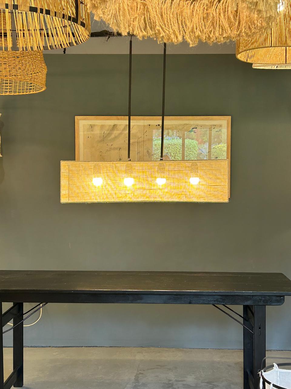 Lampara rectangular con estructura de hierro forrada en arpillera. Disponible en 3 tamaños. Pedila con o sin plafon para el techo. Puede colgar de vástagos (caños que sujetan la lampara y por dentro va el cable ) o con cable textil (sin vástago).