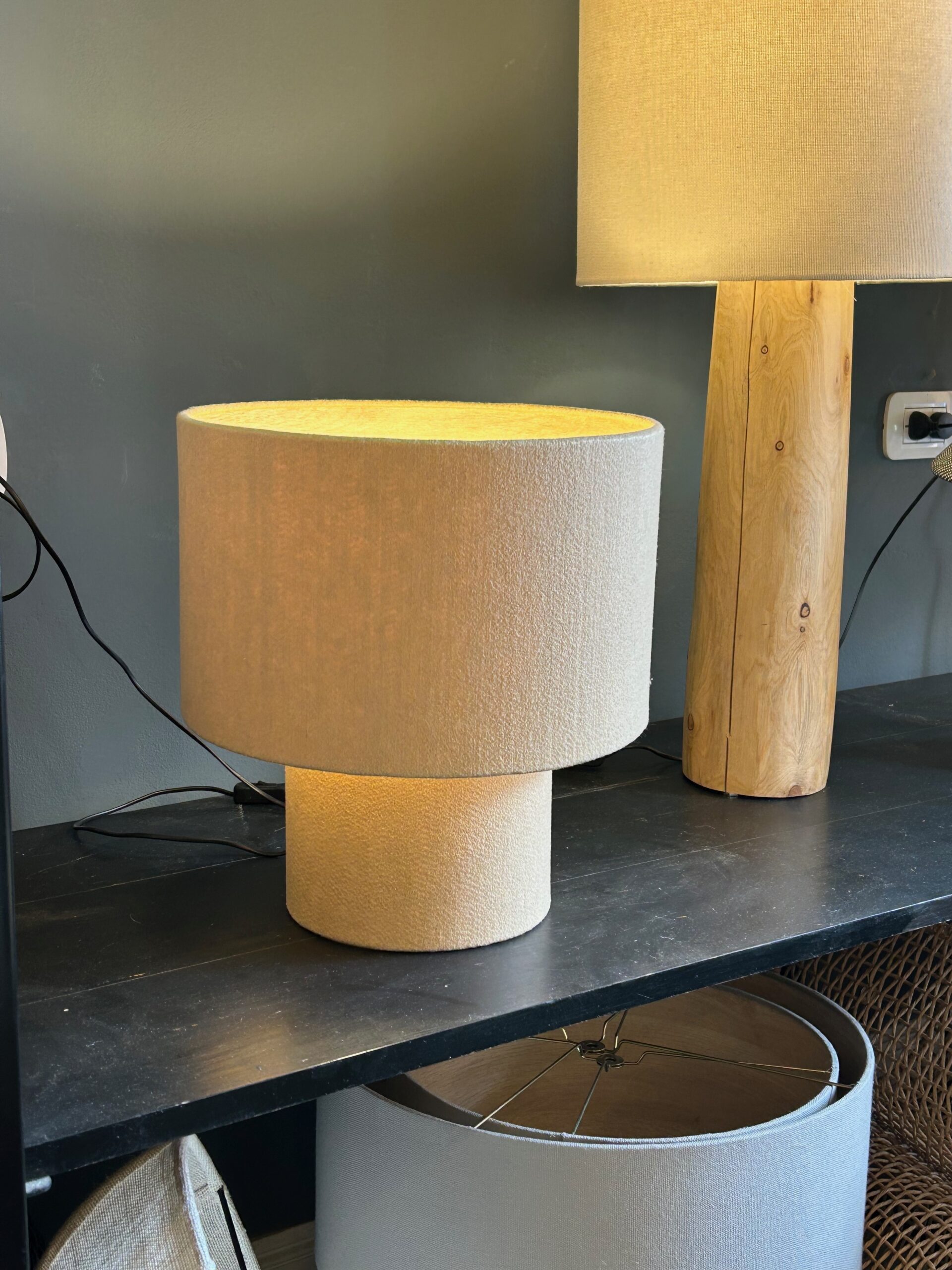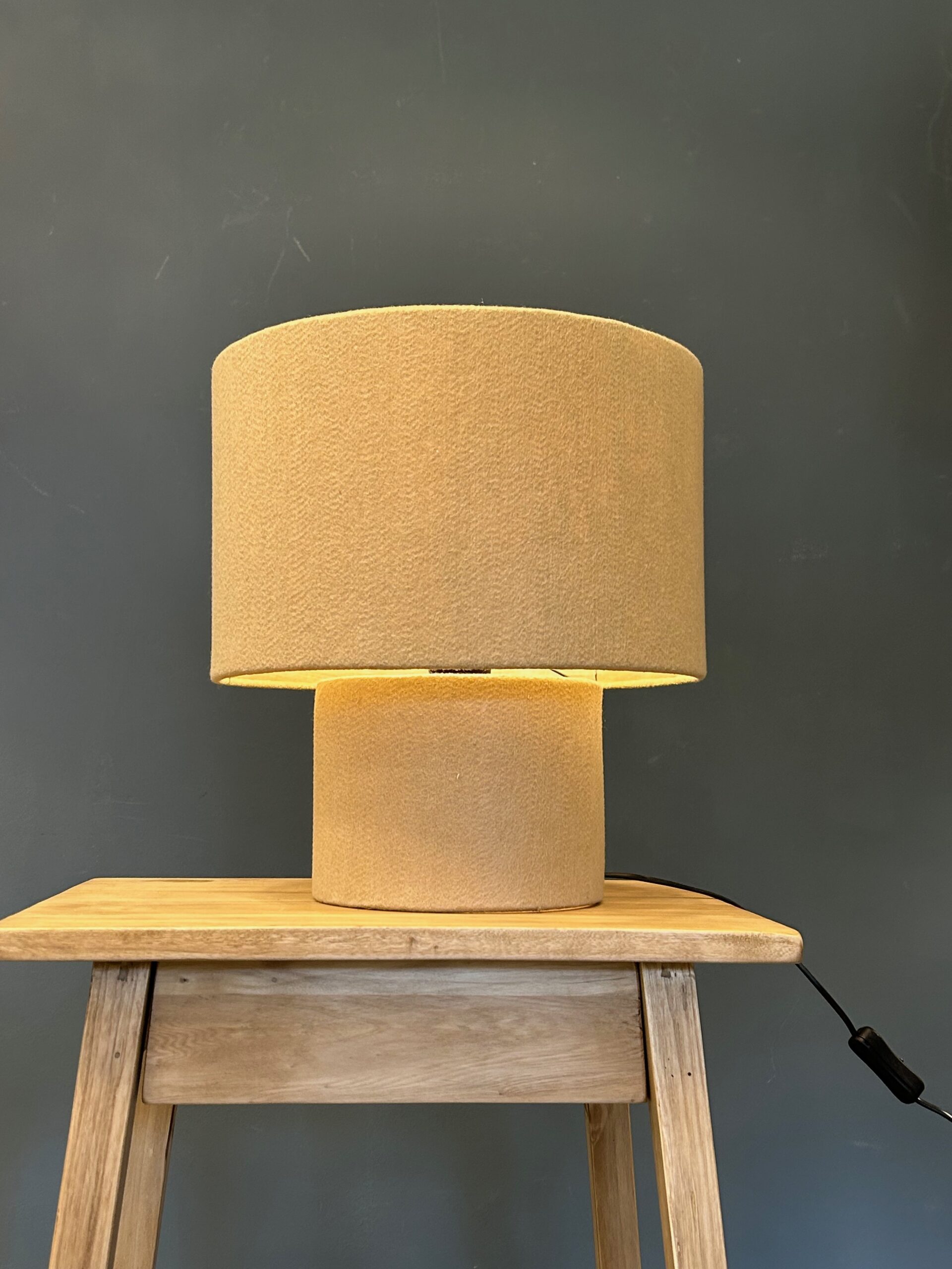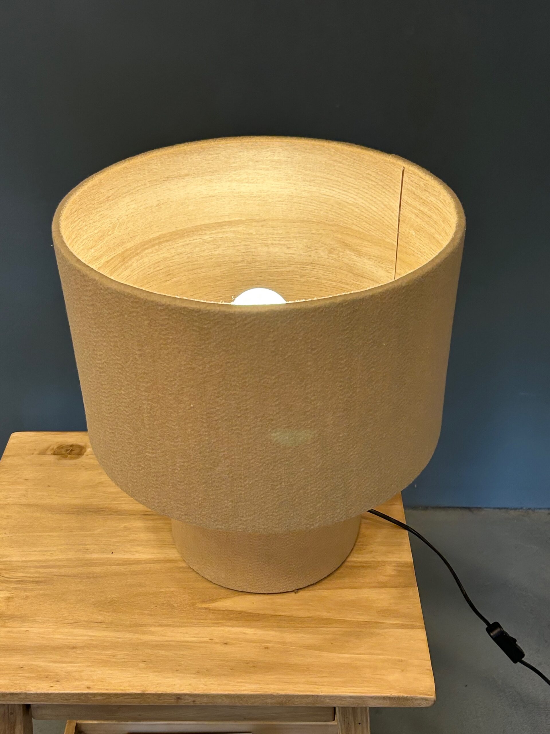 Lampara fabricada con tela de felpa disponible en diferentes colores. Pedila con o sin interior de madera.