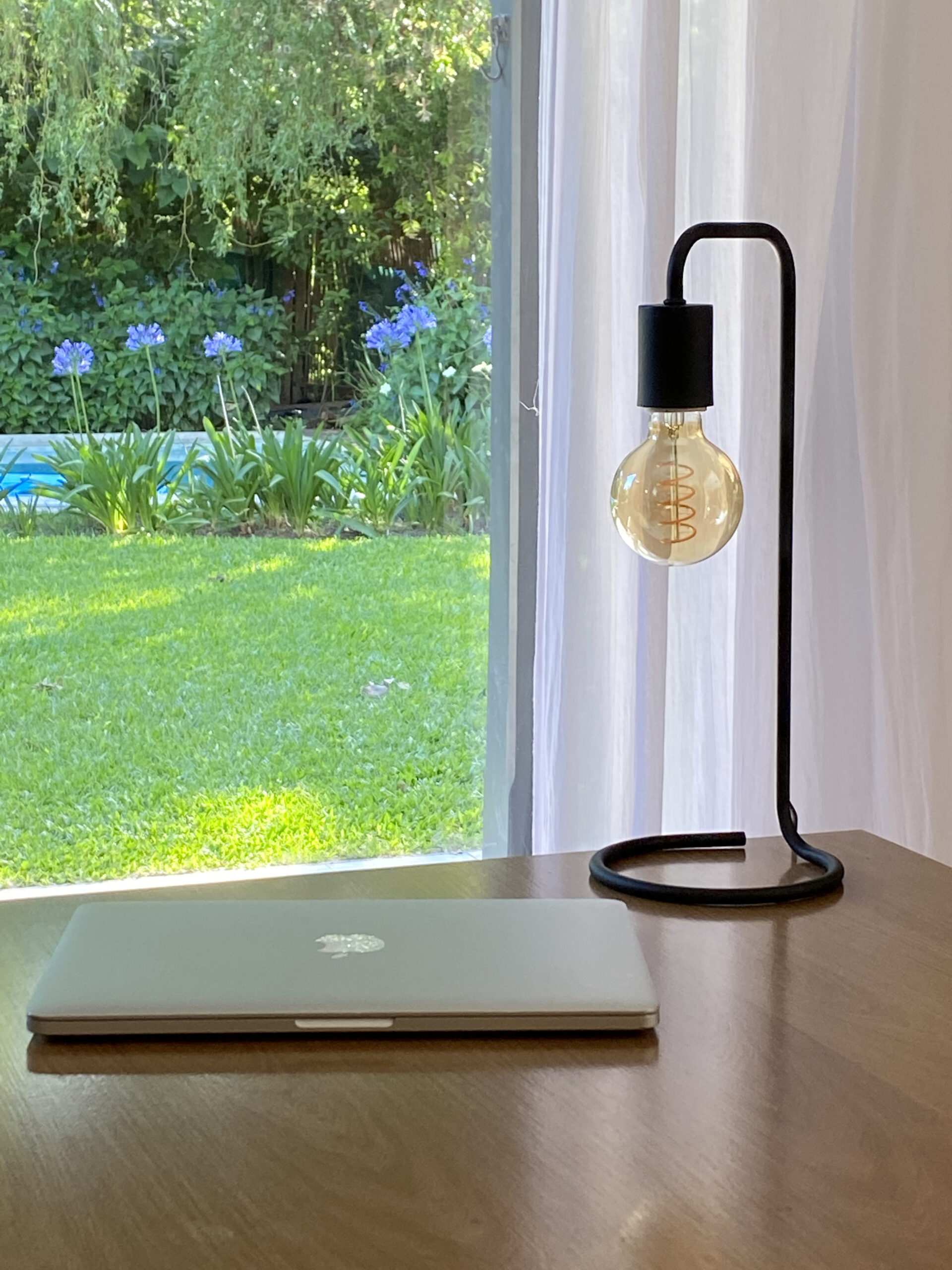 Lámpara de hierro de 40 cm de altura con base de 15 cm de diámetro. Incluye foco de luz filamento. Disponible en negro, blanco, cromado o bronce.
