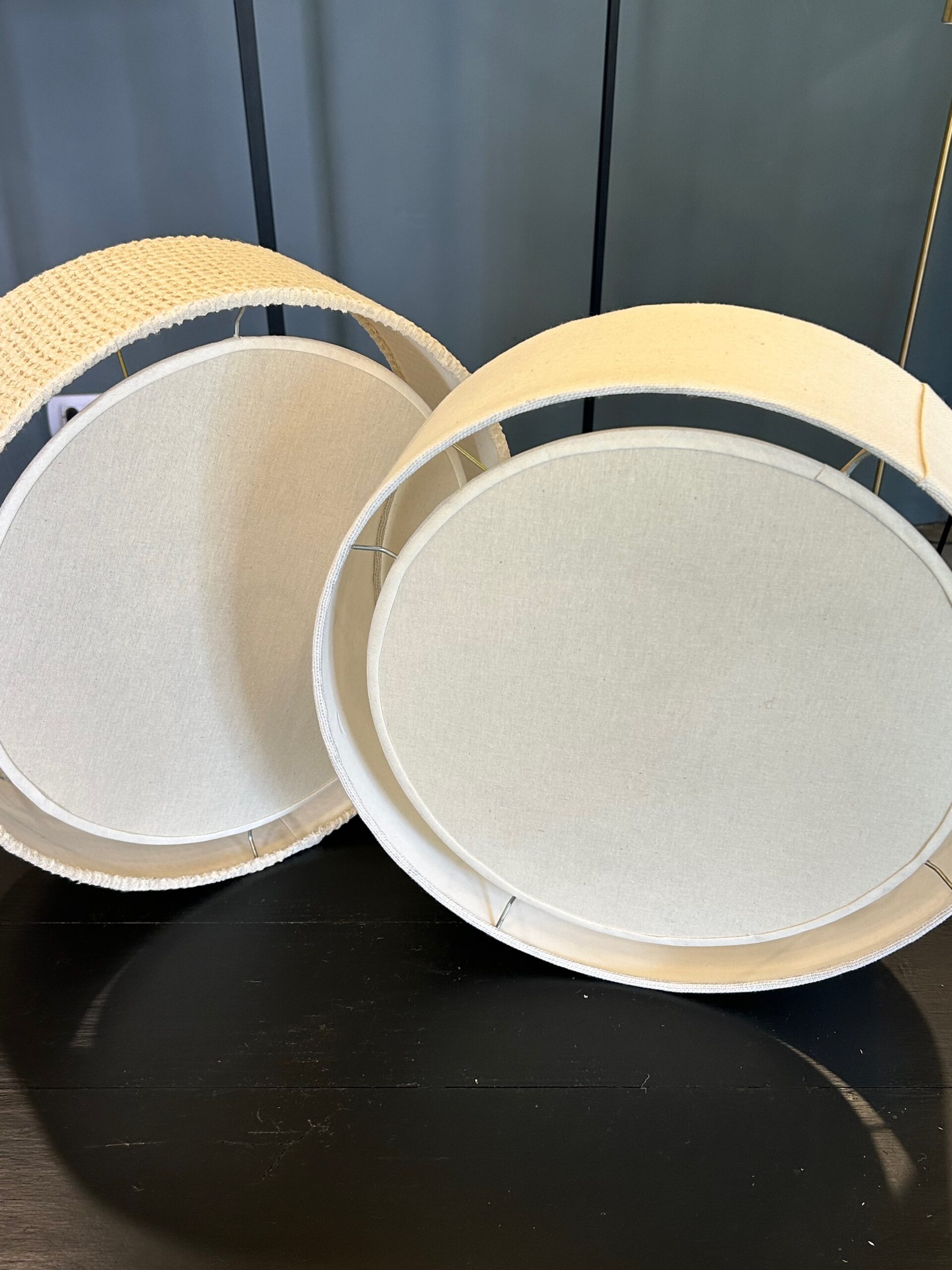 Plafones fabricados en diferentes telas y colores. Electrificados con dos luces y con difusor desmontable de lino. Los plafones miden entre 12 y 15 cm de altura dependiendo el diametro. Se pueden hacer en otras medidas a pedido del cliente.
