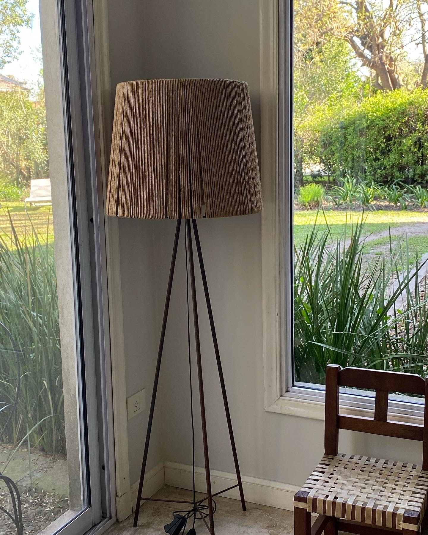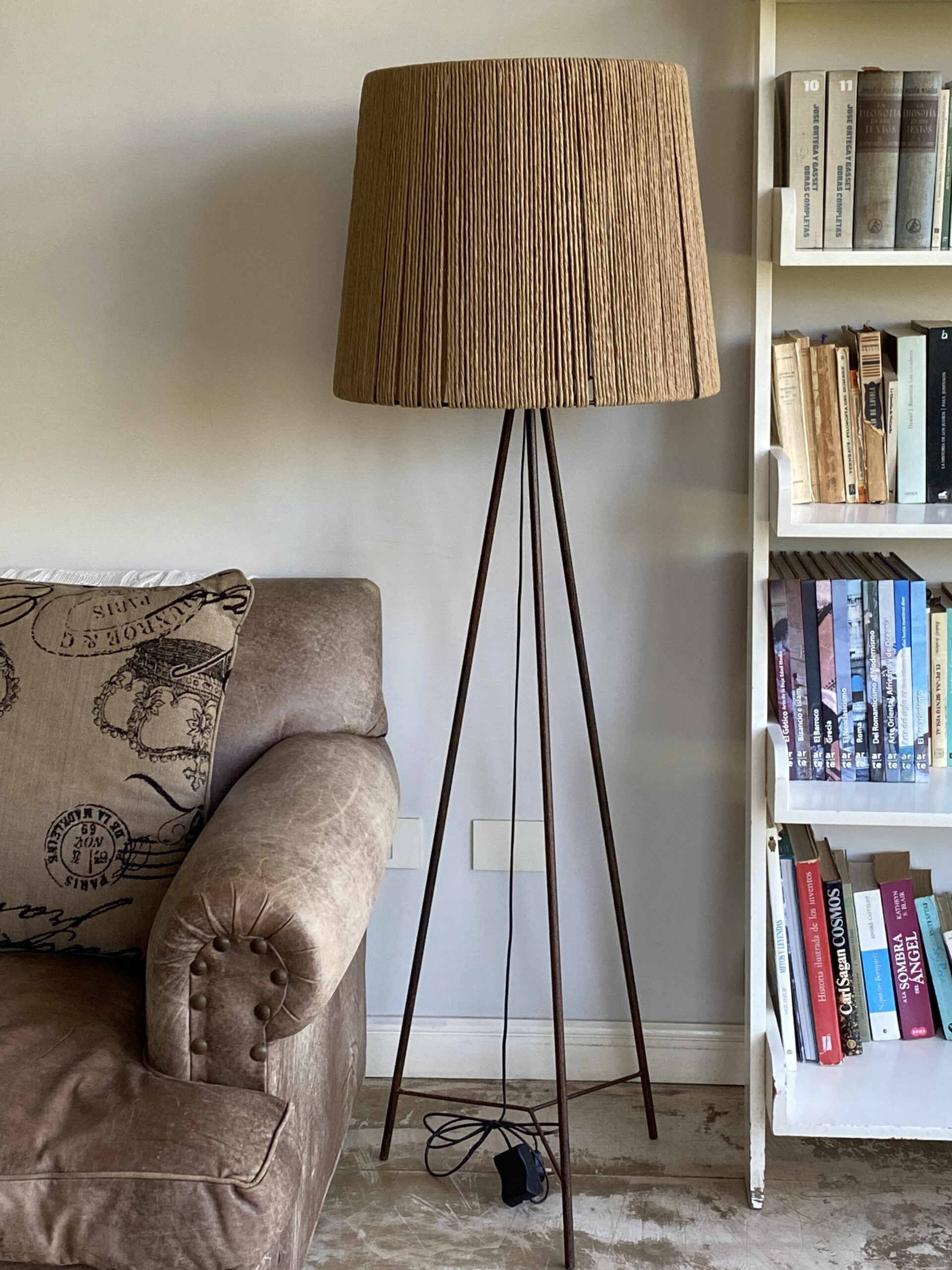 Lámpara trípode de hierro de 1,50 mts de altura total con pantalla en hilo de papel, lino o arpillera de 35 cm de diámetro superior/45 cm de diámetro inferior y 40 cm de altura. Pie en oxido o negro